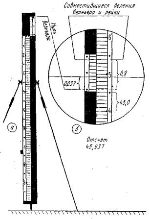 Рис. 24. Дальномерная рейка из комплекта Redta 002 и пример отсчитывания по ней. На рейке для Redta 002 имеются два верньера; внутренний дает возможность определять расстояние до 122 м, а внешний - от 50 до 172 м; при использовании внешнего верньера отсчитанное расстояние увеличивается на 50 м. При определении превышений тахеометром Redta 002 необходимо помнить, что при КП визирная ось зрительной трубы расположена выше оси вращения трубы на 2,2 см, а при КП - ниже на 2,2 см. Учитывая наличие на вертикальном круге двух типов делений, определение превышений можно производить либо без таблиц с использованием отсчётов тангенсов углов наклона, либо с применением таблиц превышений по измеренным углам наклона. § 9. Исследования теодолитов и оптических дальномеровПри исследовании теодолитов, кроме перечисленных в § 3 общих для нивелиров и теодолитов характеристик, определяются дополнительно следующие. 1. При наличии шкалового микроскопа или микроскопа-микрометра с подвижной шкалой определяется соответствие видимой величины одного деления круга видимой длине шкалы отсчётного микроскопа (их несоответствие называют реном). Во время исследования шкалового микроскопа один из штрихов круга совмещают с началом шкалы, а по соседнему штриху круга производят отсчет на конце шкалы. Такие отсчёты делают по всему кругу через 30° и затем выводят среднее значение рена, которое должно быть в пределах точности отсчитывания. При необходимости исправление рена производится изменением увеличения отсчётного микроскопа (отдельно для горизонтального и вертикального кругов). Работа по исправлению ренов должна производиться в строгом соответствии с рекомендациями заводских инструкций для каждого инструмента. При исследовании рена микроскопа с подвижной шкалой вначале вращением барабана начало шкалы совмещают со штрихом, затем наводящим винтом алидады круга совмещают деления круга со штрихом или с противоположными делениями, после чего вращением барабана совмещают соседние деления круга и производят отсчет по штриху шкалы микроскопа. 2. При наличии оптического центрира его труба должна давать четкое изображение сетки и предмета визирования. Исследование производится обычным способом, как и зрительной трубы инструмента: получение четкого изображения сетки осуществляется вращением диоптрийного кольца, предмета - выдвижением окулярной трубки от руки. 3. Для каждого теодолита необходимо тщательно определить коэффициент нитяного дальномера зрительной трубы. Определение производится при помощи базиса, разбитого на ровной местности на участки по 20 м со средней ошибкой не более 1:2000. Расстояния, определенные при помощи дальномера по рейке, сравнивают с известными из предварительных измерений базиса и выводят средний коэффициент дальномера для средних рабочих расстояний. Полевые поверки и юстировки оптических теодолитов 1. Поверка уровней при алидаде горизонтального круга. Ось цилиндрического уровня при алидаде горизонтального круга должна быть перпендикулярна, а ось круглого уровня - параллельна вертикальной оси вращения теодолита. Поверка и юстировка производятся так же, как. аналогичного условия у нивелиров. 2. Поверка сетки нитей зрительной трубы. Вертикальная нить сетки зрительной трубы должна находиться в одной плоскости с вертикальной осью вращения 