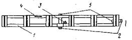 Рис. 22. Дальномерная рейка из комплекта ОТД. Рейки снабжены цилиндрическими втулками 2 и уровнями 5 для установки в горизонтальное или вертикальное положение, а также оптическим визиром 3 для установки перпендикулярно к визирному лучу дальномера. Температура рейки определяется по термометру 4. Коэффициент K дальномера ОТД определяется для малых базисов. Расстояние при помощи ОТД вычисляется по формуле D = D' + C, где C = 0,119 м - постоянная дальномера,