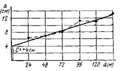 = 0, и выводят среднее значение угла наклона В теодолитах, имеющих уровень только при алидаде горизонтального круга, после вычисления αср отсчет, соответствующий ему, устанавливают вращением наводящего винта трубы, а отклонение визирной оси от точки устраняют вращением вертикально расположенных исправительных винтов сетки. В теодолитах с компенсаторами исправление MO производится либо так же, как в теодолитах с уровнем только при алидаде горизонтального круга, либо при наведении визирной оси на точку. Отсчет, соответствующий углу наклона αср при MO = 0, устанавливается вращением специальной юстировочной призмы. 7. Поверка оптического отвеса теодолита. Визирная ось оптического отвеса должна совпадать с осью вращения теодолита. У инструментов, снабженных оптическими отвесами, встроенными в алидаду, эта поверка производится поворотом алидады на 180° после центрирования теодолита при отвесном положении вертикальной оси вращения теодолита. Если визирная ось оптического отвеса сместится с точки, то ее необходимо исправить на половину отклонения при помощи исправительных винтов, расположенных у окуляра под крышкой 13 (см. рис. 15, б). Исследование дальномеров При исследовании дальномеров основная задача состоит в определении характеристик: коэффициента дальномера, постоянной дальномера, постоянного угла клина. Для ДД-3 определяется коэффициент дальномера K и постоянная C. Определение коэффициента дальномера и его постоянной производится на базисе, созданном предпочтительно на ровной местности, чтобы не было необходимости вводить поправки за наклон линий. Точность измерения длин при создании базиса должна быть выше точности определения расстояний дальномером не менее чем в три раза. Интервалы базиса (20 - 24 м) для ДД-3 можно измерять компарированной рулеткой с динамометром с измерением температуры во время работы при фиксировании концов штрихами на кольях (средняя квадратическая ошибка 1:7000). Для ОТД базис должен измеряться при помощи проволок со средней квадратической ошибкой не грубее 1:20000. Длина базиса должна соответствовать диапазону работы дальномера. После измерения длин базиса их значения приводят к горизонту. Для определения коэффициента и постоянной дальномеров типа ДД-3 теодолит с насадкой устанавливают на одном конце базиса, а затем на всех точках последовательно устанавливают дальномерную рейку, по которой производят отсчёты дальномерных расстояний не менее чем пятью приемами с выведением среднего (по каждой стороне рейки). Затем теодолит устанавливают на втором конце базиса и измерения повторяют. Одновременно с отсчётами по рейке производят отсчет по вертикальному кругу для определения угла наклона визирной линии. В полученные средние значения расстояний вводят поправки за наклон. Для определения постоянной дальномера вычисляют отклонения измеренных по дальномеру diи расстояний на базисе от их истинных значений di ∆i = di - diи. Затем на миллиметровой бумаге строят график ∆i по длине базиса (рис. 25). Соединив точки ∆i, получают ломаную линию, осредняют ее и проводят до пересечения с осью ординат. Отрезок от начала оси ординат до пересечения ее с осредняющей линией дает величину постоянной C с соответствующим знаком.