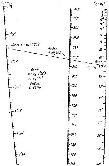 Записи отсчётов и вычисления горизонтальных углов ведутся в графах 3 - 8 журнала, вертикальных углов - в графах 9 - 14. Контроль при измерении горизонтальных углов - постоянство значения двойной коллимационной ошибки, вертикальных - постоянство MO. Обработка журнала теодолитного хода с применением постоянного вертикального базиса длиной 2 м (см. табл. 11) начинается после проверки полевых записей и вычислений с определения горизонтального проложения либо по формуле (7), либо при помощи номограммы (рис. 27) по разностям и суммам углов α1 и α2 наклона визирной оси при наведении на концы базиса.