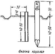 Рис. 27. Схематическое изображение номограммы для определения расстояний по постоянному вертикальному базису. Горизонтальные проложения линий заносятся в графу 16. Затем по таблицам вычисляется превышение h' (графа 17) h' = dtgα и превышение h = h' + i - l с записью в графу 18 для промежуточных точек и в графу 19 - для связующих; для последних при измерении в прямом и обратном направлениях и допустимом расхождении вычисляются средние значения (графа 20). Невязка вычисляется обычным способом. Затем производятся аналогично предыдущему распределение невязок и вычисление отметок точек. Глава IIIЗАКРЕПЛЕНИЕ СЪЕМОЧНОГО ОБОРУДОВАНИЯ§ 13. Цель и способы закрепленииПосле рекогносцировки местности намеченные точки съемочного обоснования закрепляют, чтобы обеспечить их надежное сохранение и отыскание для последующего использования. Закрепление точек может быть временное и постоянное. Временные или рабочие точки или центры должны сохраняться, как правило, только в период производства съемочных или разбивочных работ; постоянные центры применяются, для закрепления при необходимости сохранить положение точек съемочного обоснования длительное время. В зависимости от конкретных физико-географических условий способы закрепления могут быть разными. Так, в местности малонаселенной сохранность центров хорошая, однако приходится принимать меры для того, чтобы облегчить их отыскание: окапывать центры, устанавливать опознавательные знаки и т. д. В населенных пунктах необходимо учитывать постоянное их развитие и переустройство и больше заботиться о сохранности центров. Применение того или иного знака зависит также и от имеющихся в наличии средств и материалов. Для территорий городов, поселков и промышленных площадок в 1970 г. разработаны и утверждены Главным управлением геодезии и картографии при Совете Министров СССР центры геодезических пунктов, обязательные для всех ведомств и учреждений. Типы центров разработаны с учетом достаточной долговечности и устойчивости, а также возможности максимальной механизации и высокой производительности работ как при закладке центров, так и при их использовании. Эти же центры с небольшими изменениями должны использоваться и в местах, где не предполагается строительство. § 14. Типы знаков, применяемых для закрепления съемочного обоснованияЕсли местность малонаселенная лесистая, то пункты закрепляются коваными гвоздями (костылями), забитыми в пни деревьев или в специально вкопанные столбы (рис. 28). В местности малонаселенной безлесной пункты закрепляются металлическими трубами (рис. 29), окопанными канавой.
