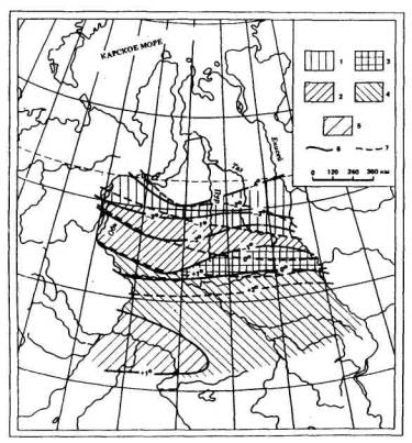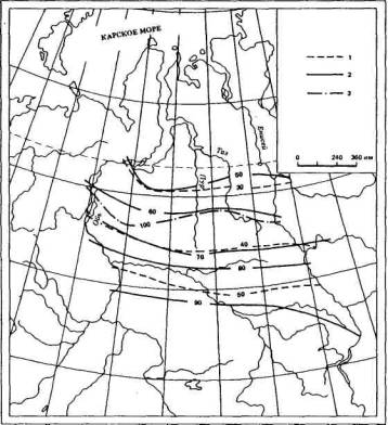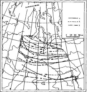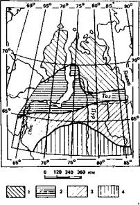 промерзания и протаивания грунтов Качественные показатели этих процессов зональны. Особенности их изменений в Западной Сибири показаны на картах-схемах (рис. 2, 3). Приступая к разработке мероприятий по регулированию каких-либо показателей сезонного промерзания и протаивания грунтов необходимо знать их особенности на исследуемой территории.