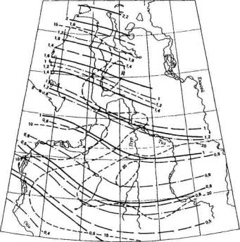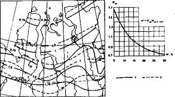 2.72. Весьма действенным регулятором глубины прямого сезонного протаивания грунтов является растительный покров. Изменяя его, можно изменить глубину проявления этого процесса на 29-54% в зависимости от прогрева поверхности, характера напочвенного покрова, снегонакопления и влажности грунтов. В табл. 7 показано увеличение глубины прямого протаивания, %, при удалении напочвенного покрова при разных, климатических, поверхностных и грунтовых условиях. 2.73. Наиболее существенное влияние на сезонное промерзание и протаивание оказывает увлажненность (льдистость) грунтов, изменяя которую, можно регулировать глубину проявления этих процессов. К настоящему времени дана количественная оценка влияния увлажненности лишь на глубину однонаправленного прямого промерзания и протаивания [17]. В табл. 8 показано увеличение глубины прямого протаивания суглинков, %, при уменьшении их влажности с 30 до 15% на участках оголенных и с дерновым покровом, а также суглинка с влажностью 35% по сравнению с глубиной протаивания торфа, имеющего влажность 400%, при разной сумме градусо-месяцев теплого и холодного периода и разном снегонакоплении. 2.74. При однообразии литологического состава промерзающих и протаивающих грунтов учитывать влияние влажности можно с помощью коэффициентов. Картограммы глубины прямого сезонного протаивания глинистых грунтов с влажностью 20% приведены на рис. 11, песчаных при влажности 15% на рис. 12 и глубины прямого сезонного промерзания тех же по составу и влажности грунтов на рис. 13 и 14. Указанные на картограммах коэффициенты позволяют сравнительно легко (методом подбора) определить, насколько нужно изменить влажность грунтов, чтобы глубина их прямого промерзания или протаивания не выходила за требуемые пределы при естественных изменениях погодных условий за репрезентативный или требуемый многолетний период.