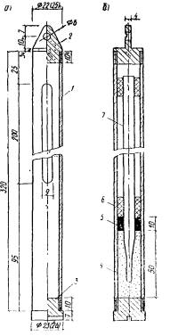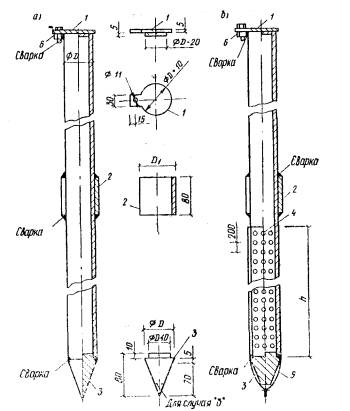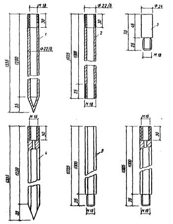 ПРИЛОЖЕНИЕ 12МЕТОДИКА ЗОНДИРОВАНИЯ С ИЗМЕРЕНИЕМ ТЕМПЕРАТУРЫ ГРУНТАТермозонд (зонды и трубки) показан на рис. 4. Перед зондированием рекомендуется подготовить лидерную скважину в оттаявшем грунте. Для этого в грунт погружается составной зонд, выполненный из шестигранной буровой стали 22/25 и после отказа зонды поочередно извлекаются зажимами и рычагами и развинчиваются. В подготовленную скважину погружается составная трубка. На дне трубки осуществляется контрольное измерение температуры, например электротермометром или ртутным малоинерционным термометром. Выдержка термометра должна быть не менее 1 ч. Если температура нулевая, это свидетельствует о том, что трубка достигла поверхности вечномерзлого грунта, иногда ограничиваются одним контрольным измерением температуры на дне трубки или выполняют по длине трубки несколько измерений для последующего нанесения па чертеж изолиний температур в температурном профиле. Несколько измерений по длине трубки рекомендуется осуществлять там, где наблюдаются нарушения температурного режима грунта по сравнению с нормальным.