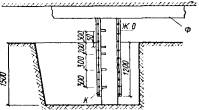 Рис. 5. Схема обследования бетона фундаментов Бурение ведется между стержнями арматуры фундамента или свай. Отбор проб осуществляется на расстоянии 5, 20, 50 и 80 см ниже поверхности грунта и в подполье от поверхности грунта на высоте 30 см. Обследованный фундамент усиливается обоймой. Если необходимо, обойма прогревается. 3. Полученные при бурении керны обрабатываются по торцевым поверхностям алмазной дисковой пилой и подвергаются испытанию на временное сопротивление сжатию. По результатам испытаний с введением соответствующего коэффициента определяется марка бетона на время обследования фундамента. Испытания ведутся согласно ГОСТ 10180-78. «Бетоны. Методы определения прочности на сжатие и растяжение». Анализ полученных результатов служит основанием проектной организации для разработки проекта массовой реконструкции (усиления) фундаментов. Реконструкцию фундаментов рекомендуется выполнять в начале лета. ПРИЛОЖЕНИЕ 15КОНСТРУКЦИЯ ИНЕРЦИОННОГО ТЕРМОМЕТРАФорма записи измерений температур в контрольных скважинах Объект________ № скважины______
