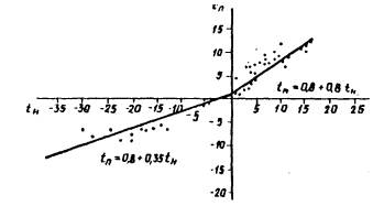 В графе 2 записывается tн - средняя температура наружного воздуха за сутки или за два ближайших срока измерений, в графе 3 tп – средняя температура в подполье по записи суточного термографа или показаниям инерционного термометра. Все данные разбиваются на две группы. В первую группу вводим данные от tн = + 16 до tн = + 1°С, во вторую - от tн = -4,2 до tн = -36°С. В каждой группе в примере по 24 измерения. Температуры суммируются и для каждой группы составляются уравнения: I группы 88,9 = 12А + 92п: II группы - 127,2 = 12А - 221,7п. Вычитая уравнение II группы из уравнения I группы, получим, что 216,1 = 313,7п, откуда п = 0,69 и А = 2,12, следовательно: tп =3,12 + 0,69tн (1) Построенный по уравнению график показан как пример на рис. 9. Среднегодовая температура под зданием будет равна: где tг = 365 дней; tз, tл - продолжительность соответственно зимнего и летнего периода в сутках; lм и lт - теплопроводность грунта в пределах сезоннооттаивающего слоя соответственно в мерзлом и талом состоянии; tз.п, tл.п - средние соответственно зимняя и летняя температуры подполья.