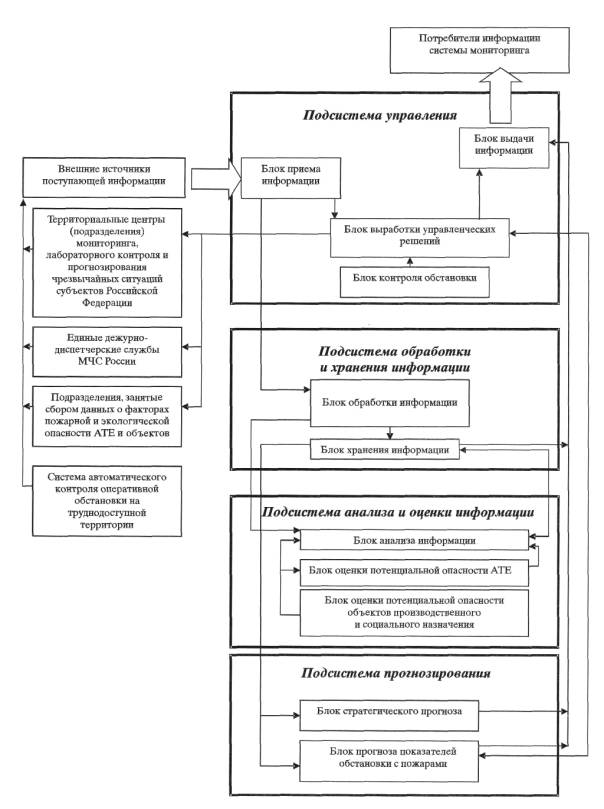 Система мониторинга пожарной и экологической безопасности Кроме того, информация системы мониторинга пожарной и экологической безопасности включает в себя: - систематизированные в определенном порядке данные об обстановке с пожарами за определенный период, устанавливаемый органами управления; - нормативно-справочные и иные материалы, сведенные в статистические регистры и базы данных, обеспеченные комплексом программно-технологических и технических средств для выявления характера связей состояния пожарной безопасности региона с социально-экономическими, природно-климатическими и другими факторами. Подсистема управления включает в себя блоки контроля обстановки и выработки решений, которые взаимодействуют с блоком выдачи информации и внешними источниками информации, а также с подсистемой прогнозирования. Из блока приема информация может поступать как в подсистему обработки и хранения информации (блок обработки информации), так и в блок выработки управленческих решений подсистемы управления. В блоке выработки управленческих решений осуществляется автоматическое управление всей системой в зависимости от результатов анализа поступающей в систему мониторинга информации. В блоке выдачи информации проводится официальная выдача потребителям информации в установленной для системы стандартной форме. Подсистема обработки и хранения информации получает информацию из подсистемы управления. Здесь осуществляется ее первичная обработка (блок обработки информации), т.е. приведение к виду, пригодному для дальнейшего использования. Эта информация вводится, сортируется, кодируется и передается в блок хранения информации и подсистему прогнозирования обстановки с пожарами. Из блока хранения информация поступает в подсистему анализа и оценки информации и подсистему прогнозирования. Здесь осуществляется анализ информации, проводится автоматическое сравнение первоначальных, предыдущих и текущих значений параметров. В соответствующих блоках проводится оценка потенциальной опасности объектов производственного и социального назначения и ATE в целом. Из подсистемы обработки и хранения информация может быть доставлена потребителям: для принятия решений по обеспечению пожарной безопасности населения; проведения обоснованной политики в области пожарной безопасности; совершенствования региональных моделей обстановки с пожарами, методов управления СОПБ и разработки комплекса соответствующих мероприятий и т.п. В подсистеме прогнозирования выявляются тенденции изменения обстановки с пожарами в оперативном режиме и среднесрочной перспективе, а также осуществляется передача информации в блок выработки решений для создания перечня и определения последовательности реализации профилактических мероприятий в целях снижения пожарных и экологических рисков на предприятиях и ATE. В данной подсистеме блок стратегического прогноза обстановки с пожарами функционирует в штатном режиме работы системы мониторинга. Блок прогноза показателей обстановки с пожарами - в оперативном режиме. Таким образом, предложенная система мониторинга представляет собой информационную систему комплексной оценки состояния пожарной и экологической безопасности в регионе, определения направлений решения задач противопожарной защиты