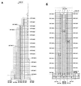 а - многофункциональный деловой комплекс (участок № 14); б - многофункциональный административный комплекс (участок № 4) Рис. 1. Схемы расположения пунктов измерений стационарных станций мониторинга несущих конструкций зданий ММДЦ «Москва-Сити» Проекты стационарных автоматизированных станций мониторинга для высотных зданий включают в себя: пояснительную записку; схемы расположения измерительных пунктов станции на несущих конструкциях высотного здания с чертежами установки приборов и ограждающих конструкций, предотвращающих несанкционированный доступ к этим приборам; электрическую схему кабельных соединений станции; спецификацию аппаратуры, оборудования и материалов комплектации станции; смету на оборудование, приборы, работы по монтажу и пусконаладочные работы. Пояснительная записка каждого проекта содержит следующие разделы: 1. Стационарная станция мониторинга (состав станции СМДС-В для каждого конкретного объекта). 2. Установка приборов (информация по установке различных приборов на несущих конструкциях объекта). 3. Технические требования к кабельной сети (информация по проводке кабелей между измерительными пунктами станции и местом централизованного сбора информации). 4. Технические требования к компьютерно-информационному центру (информация об оборудовании помещения, где устанавливается компьютер, на который поступает информация от измерительных пунктов станции). 5. Технические требования к применяемым компьютерам и математическому обеспечению (информация о составе вычислительного комплекса, его характеристиках и основная информация о выполняемых математическим обеспечением функциях). 6. Методология проведения мониторинга (основные сведения о методологических основах проведения мониторинга с помощью стационарной станции мониторинга). 7. Технология проведения мониторинга (понятие передаточной функции и технология получения таких функций для частей объекта, выделенных данным проектом, а также технология измерения и анализа кренов объекта). 8. Регламент проведения мониторинга (информация о сроках и объемах работ при проведении мониторинга несущих конструкций объекта с помощью стационарной станции мониторинга). 9. Дополнительные технические требования (информация о дополнительных измерениях, проводящихся на объекте, целях таких измерений, составе оборудования и приборов для этих работ). На рис. 1 и 2 в качестве примера приведены схемы расположения пунктов измерений на конкретных объектах, для которых проводилось проектирование стационарных станций мониторинга.