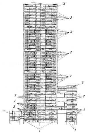 Измерительные пункты: 1 - с наклономерами; 2 - с акселерометрами ЦТА-СМ; 3 - с сейсмометрами ПРДП-СМ и акселерометрами ЦТА-СМ Рис. 2. Схема расположения пунктов измерений стационарной станции мониторинга несущих конструкций здания законодательной и исполнительной власти Москвы ММДЦ «Москва-Сити» (участки № 15 и № 1)