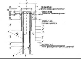 1 - струнные тензометры; 2 - удлиненные датчики деформации бетона (LG) с оптоволоконным сенсором; 3 - плита железобетонная (h = 4 м); 4 - гидроизоляция со стяжкой; 5 - бетонная подготовка с арматурой (d = 300 мм); 6 - крупнозернистый песок (d = 100 мм); 7 - гравий, щебень (d = 300 мм); 8 - бурозабивная свая Рис. 3. Схема установки датчиков деформаций на сваю под зданием законодательной и исполнительной власти Москвы ММДЦ «Москва-Сити» (участок № 15) Для двух высотных объектов (72-этажное здание законодательной и исполнительной власти Москвы, участок № 15, и 67-этажного здания многофункционального административного комплекса, участок № 4) в дополнение к требованиям МГСН 4.19-2005 в соответствии со специальным техническим заданием на проектирование стационарной станции мониторинга деформационного состояния несущих конструкций разработана совместно с ИПК МГСУ Технопарк «Строительство» дополнительная часть проекта, связанная с контролем технического состояния свай и фундаментной плиты под этими объектами. Была запроектирована установка датчиков давления здания на подстилающие грунты основания в межсвайное пространство непосредственно под бетонную подготовку фундаментной плиты. Для контроля напряжений, действующих в сваях и фундаментной плите, предусмотрена установка датчиков деформаций на арматуре свай и фундаментной плиты. На рис. 3 показана схема установки датчиков на одном из объектов. Таким образом, МНИИТЭП в течение 2005-2006 гг. разработаны основы проектирования и впервые запроектированы стационарные станции мониторинга несущих конструкций высотных зданий, удовлетворяющие требованиям МГСН 4.19-2005. В 2005 г. институт также разработал «Временные рекомендации по эксплуатации многофункциональных высотных зданий и зданий-комплексов в г. Москве» (РМ-2957), в которых приведен регламент работы стационарных станций мониторинга для высотных зданий. ЛИТЕРАТУРА 1. Гурьев В.В., Дорофеев В.М. Обеспечение безопасности работы несущих конструкций высотных зданий // Пром. и гражд. стр-во. 2004. № 12. 2. Пат. РФ 2254426. Способ определения изменений напряженно-деформированного состояйия конструкций здания или сооружения/ ГУП МНИИТЭП, 2005. 3. Пат. РФ 2292433. Способ определения изменений напряженно-деформированного состояния конструкций здания или сооружения сложной пространственной формы / ГУП МНИИТЭП, 2007. 4. Дорофеев В.М., Катренко В.Г., Назьмов Н.В. Автоматизированная станция мониторинга технического состояния несущих конструкций высотных зданий // Материал междунар. конф.-выставки «Уникальные и специальные технологии в строительстве (UST-Build 2005)». Москва, 12-13 апреля 2005 (Журнал «Промышленное и гражданское строительство» № 5 2007 г.)