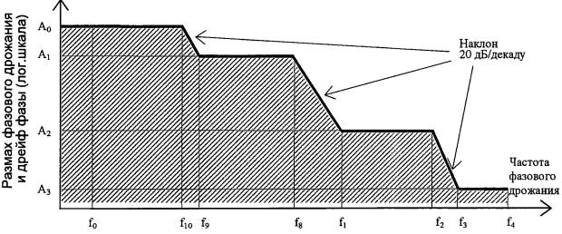"Рисунок 3" 2.4. Оборудование в точке Т' обеспечивает работу с соединительной линией, имеющей затухание на полутактовой частоте до 6 дБ для скоростей цифрового сигнала 2,048 Мбит/с и 8,448 Мбит/с и до 12 дБ для скорости цифрового сигнала 34,368 Мбит/с. 2.5. Затухание несогласованности в полосе частот, лежащей в пределах (0,05 - 1) от значения тактовой частоты, составляет не менее 18 дБ при номинальном значении входного сопротивления 120 Ом (симметричное) для скорости передачи 2,048 Мбит/с и при номинальном значении входного сопротивления 75 Ом (несимметричное) для скоростей передачи 8,448 Мбит/с и 34,368 Мбит/с. 2.6. Фазовое дрожание и дрейф фазы: 2.6.1. Нижний предел максимально допустимого фазового дрожания и дрейфа фазы на входе цифрового интерфейса приведен на рисунке 4. Зависимость размаха и частоты фазового дрожания или дрейфа фазы на входе цифрового интерфейса от скорости передачи цифрового сигнала приведена в таблице N 1.