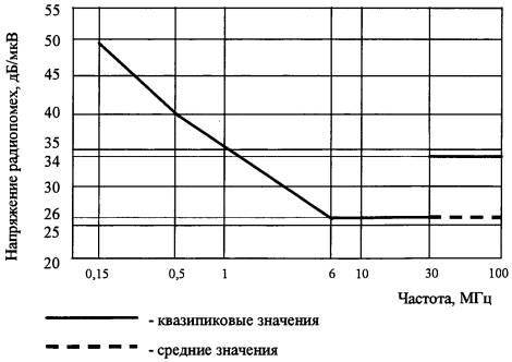 3. Требования к параметрам интерфейса передачи данных установлены в приложении N 7 и приложении N 25 к Правилам применения оборудования проводных и оптических систем передачи абонентского доступа, утвержденным приказом Министерства информационных технологий и связи Российской Федерации 24.08.2006 N 112 (зарегистрирован в Министерстве юстиции Российской Федерации 4 сентября 2006 г., регистрационный N 8194). Приложение N 6Требования к параметрам электропитания оборудования1. При электропитании оборудования от сети переменного тока номинальным напряжением 220 В и частотой 50 Гц соблюдаются следующие требования: 1.1. При изменении напряжения электропитания в пределах от 187 В до 242 В оборудование соответствует значениям, приведенным в пункте 2.3 приложения N 5 к настоящим Правилам. 1.2. Оборудование, подключаемое к электрическим сетям переменного однофазного или трехфазного тока при токе нагрузки (в одной фазе) не более 16 А, устойчиво к воздействию динамических изменений напряжения сети электропитания: к провалам напряжения до значения 0,7 Uн (Uн - номинальное напряжение сети электропитания) с длительностью равной 25 периодов по 20 мс (500 мс); к прерыванию напряжения - с длительностью прерывания 1 период в 20 мс; к выбросам напряжения - с амплитудой 1,2 Uн и с длительностью выброса равного 25 периодов по 20 мс (500 мс). После прекращения указанных воздействий оборудование соответствует значениям, приведенным в пункте 2.3 приложения N 5 к настоящим Правилам. 2. При электропитании от внешнего источника постоянного тока с номинальным напряжением: минус 24, минус 48 или минус 60 В (положительный полюс источника электропитания заземлен) соблюдаются следующие требования: 2.1. Оборудование соответствует значениям, приведенным в пункте 2.3 приложения N 5 к настоящим Правилам, при изменении напряжения электропитания в следующих пределах: а) от минус 20,4 В до минус 28,8 В для напряжения минус 24 В; б) от минус 40,8 В до минус 57,6 В для напряжения минус 48 В; в) от минус 51 В до минус 72 В для напряжения минус 60 В. 2.2. При воздействии одиночного импульса прямоугольной формы с амплитудой ±20% от номинального напряжения электропитания в течение времени 400 мс и плюс 40% в течение 5 мс не должно появляться ошибок, связанных с этим воздействием. 3. В случае снижения напряжения электропитания за допустимый предел и при восстановлении напряжения в пределах значений рабочего напряжения электропитания оборудование соответствует значениям, приведенным в пункте 2.3 приложения N 5 к настоящим Правилам. Приложение N 7Требования к параметрам электромагнитной совместимости оборудования1. Требования к индустриальным радиопомехам от оборудования: 1.1. Квазипиковые значения несимметричного напряжения радиопомех* (дБ относительно 1мкВ) на сетевых зажимах составных частей оборудования в полосе частот от 0,15 МГц до 100 МГц не превышают значений, приведенных на рисунке 1. 1.2. Средние значения несимметричного напряжения радиопомех (дБ относительно 1мкВ), измеряемые с использованием детектора средних значений в полосе частот от 30 до 100 МГц, не превышают значений, приведенных на рисунке 1.