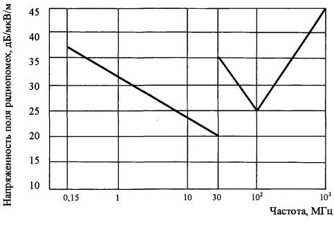 "Рисунок 1" 1.3. Квазипиковые значения напряженности поля радиопомех** (дБ относительно 1 мкВ/м) от составных частей оборудования в полосе частот от 0,15 до 1000 МГц, измеренные на расстоянии 1 м и при установке измерительной антенны на уровне 1/2 от высоты испытуемого оборудования, не превышают значений, приведенных на рисунке 2.
