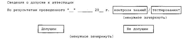 Руководитель организации Ф.И.О. М. П. *Группа организации: 1. Организации, в которых количество работающих составляет 2000 и более человек. 2. Организации, в которых количество работающих составляет от 1000 до 1999 человек. 3. Организации, в которых количество работающих составляет менее 1000 человек. 4. Экспертные организации, выполняющие работы для поднадзорных Ростехнадзору организаций. 5. Иностранные организации. 6. Организации, осуществляющие предаттестационную подготовку руководителей и специалистов. 7. Организации, в которых по согласованию с территориальным органом Ростехнадзора не создается аттестационная комиссия. К заявке на каждого руководителя (специалиста) прикладывается: 1. Копия паспорта (заверяется печатью организации). 2. Копия документа об образовании (ученой степени, ученого звания) (заверяется печатью организации). 3. Копия трудовой книжки (заверяется печатью организации). 4. Справка о прохождении курса предаттестационной подготовки и допуске к аттестации (для аттестуемых в областях А - Д). 5. Экзаменационный лист (для аттестуемых в областях А - Д) . 6. Результаты тестирования (для аттестуемых в областях А - Д) представляются аккредитованными организациями, проводившими подготовку и тестирование. 7. Проект протокола аттестационной комиссии (на группу специалистов одной организации). 8. Проект удостоверения об аттестации. Приложение 4Форма документа о прохождении курса предаттестационной подготовки и допуска к аттестации
