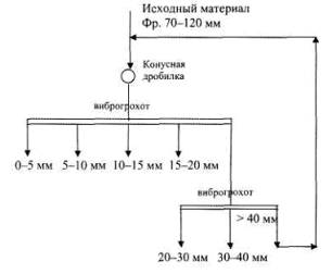 Рис. 3. Технологическая схема дробильно-сортировочной установки с использованием конусной и ударной дробилки