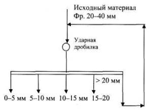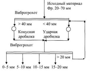 Рис. 4. Технологическая схема дробильно-сортировочной установки с использованием ударной дробилки Производство щебня освоено на предприятиях ОАО «Центродорстрой». Щебень производится с содержанием кубовидных зерен более 90%. Специальные дробилки устанавливаются непосредственно на территории АБЗ, что исключает загрязнение щебня при транспортировке и погрузочно-разгрузочных работах, при поставках его с карьеров. Впервые эта технология была применена при реконструкции МКАД (1994-1999 гг.) для устройства верхнего слоя покрытия из полимерасфальтобетона, а затем при реконструкции Киевского и Боровского шоссе, а также при строительстве автомобильных дорог МКАД - Кашира и на других объектах. По нашему мнению, имеющийся опыт целесообразно распространить на строительство других дорог федерального значения. В СоюздорНИИ совместно с корпорацией «Трансстрой» в 1999 г. был разработан Стандарт предприятия «СТП 009-99. Технология получения и контроль качества щебня узких фракций кубовидной формы». А в 2006 г. разработан проект нормативного документа СТО-ГК «Трансстрой»-009-2006 «Стандарт организации. Щебень узких фракций кубовидной формы. Требования, технология получения и контроль качества». (Журнал «Автомобильные дороги» № 6 2007 г.)