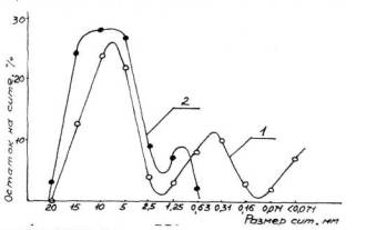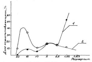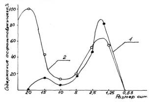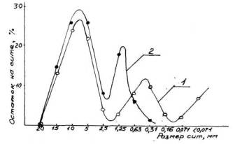 Рис. 2. Тип А на ПБВ 60 1 -○- минеральная часть, 2 -●- смесь