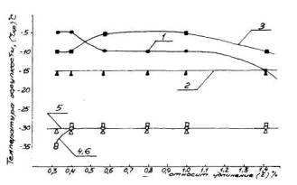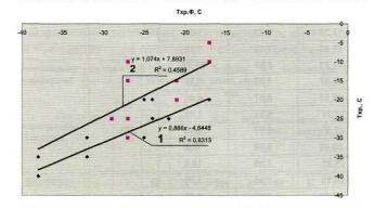 По полученным данным для образцов и для сравнения в таблице 5 для смесей были построены две зависимости температуры хрупкости образцов от температуры хрупкости вяжущего, входящего в состав смеси (рисунок 6).