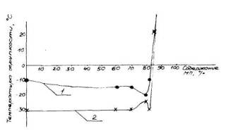 Рис. 8. Зависимость Тхр. от содержания минерального порошка (м.п.) образцов 1 -●- асфальтовяжущего на БНД 60/90 и 2 -х- полимерасфальтовяжущего на ПБВ 130 Из рисунка 7 и таблицы 8 видно, что температура хрупкости практически не зависит от относительного удлинения ни образцов на основе ПБВ и характеризуется более низким значением при минимальном относительном удлинении 0,3%, что, может быть, по-видимому, обусловлено ориентационным эффектом. Для плиточек на основе битума наблюдается заметное улучшение показателя Тхр с увеличением относительного удлинения, что пока объяснить трудно без специальных исследований. Введение 60% порошка в битум заметно улучшает Тхр по сравнению с чистым битумом, что, по-видимому, связано с извлечением хрупких смол и асфальтенов из битума за счет адсорбции их поверхностью порошка. Причем это наблюдается особенно резко при малых ﻉ, близких к реальным. Увеличение содержания порошка до 70% значительно ухудшает Тхр, что можно объяснить, по-видимому, уменьшением содержания углеводородов в битумных прослойках за счет фильтрации их в поры порошка. Эти данные носят предварительный характер, но свидетельствуют о положительном влиянии порошка на Тхр асфальтобетона при его содержании до 60% в асфальтовяжущем. Увеличение содержания минерального порошка в ПБВ и собственное его наличие в полимерасфальтовяжушем практически не влияет на значение Тхр, что свидетельствует о затруднении или невозможности десорбции компонентов из ПБВ и их фильтрации в поры минерального порошка. Тхр полимерасфальтовяжушего не зависит от содержания минерального порошка (см. рис. 8 и табл. 8) до определенного предела - 82%, а асфальтовяжушего до - 80%. Далее Тхр резко ухудшается и при содержании порошка 85%, имеет положительное значение как в случае битума, так и ПБВ. Очевидно, что при содержании минерального порошка более 80% для битума и 82% для ПБВ резко уменьшается число коагуляционных контактов в этой системе, что недопустимо как для асфальтобетона, так и для полимерасфальтобетона. Проведенные нами расчеты показали, что толщина пленки вяжущего при 60%, 70%, 80% и 82% порошка по массе составляет соответственно 2,75 мкм, 1,86 мкм, 1,18 мкм и 1,06 мкм, а при 85% порошка толщина пленки составляет 0,9 мкм. При этом плотность простейшей упаковки сферических частиц 0,487 достигается при 48% порошка, наиболее вероятной 0,613 при 60,5%, а специальной плотнейшей 0,7405 при 73,2%. При этом объем частиц порошка с сольватной оболочкой равной 0,27 мкм при 80% порошка по массе составляет 0,809, а при 82% - 0,83. Эти особенности необходимо учитывать при разработке требований к гранулометрическому составу полимерасфальтобетонных смесей. Хотелось бы также отметить еще ряд преимущественных особенностей полимерасфальтобетона по сравнению с асфальтобетоном. Анализ кривых зависимости температуры хрупкости образцов из полимер- и асфальтобетонных смесей типов А, Б и Д от глубины проникания иглы вяжущих при 25° С (рис. 9) показывает, что при равных значениях пенетрации ПБВ и битумов при 25° С температура хрупкости полимерасфальтобетонных смесей типов А, Б и Д значительно ниже (лучше), чем для асфальтобетонных.