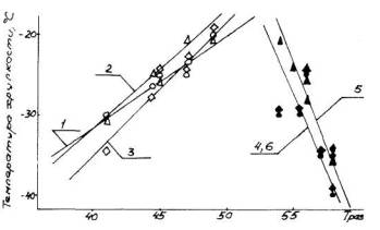 Тем не менее величина относительного удлинения образца-плитки в 2,3 раза меньше, чем в пленке битума, испытываемой по методу Фрааса (1,83%). Совершенно очевидно, что если и удастся когда-нибудь смоделировать все реальные условия, приводящие к образованию трещин на покрытии, то такой прибор и метод вряд ли будет достаточно прост и приемлем для заводских лабораторий. Поэтому за критерий обоснованности предлагаемой методики приняли наличие тесной корреляции между значением температуры хрупкости вяжущих по методу Фрааса и по предлагаемому методу. Решили, что если экспериментально удастся подтвердить наличие достаточной корреляции между температурой хрупкости вяжущего по Фраасу и по предлагаемому нами методу при одноразовом изгибе на указанном шаблоне, можно будет считать этот метод приемлемым для сопоставления асфальтобетонов и полимерасфальтобетонов по хрупкости и по трещиностойкости. В данном методе нами предлагается за температуру хрупкости (Тхр) полимерасфальтобетона при изгибе плиточек размером 50×25×4 мм, приготовленных из фракции 1,25÷0,63 полимерасфальтобетонной смеси при постепенном (периодическом) понижении температуры со скоростью 20° С/час, принимать температуру, при которой на одной из шести испытываемых плиточек (образцов) образуется трещина. А за температуру трещиностойкости (Tтp) принимается самая низкая отрицательная температура, при которой все шесть плиточек выдержали испытание на изгиб. Для подтверждения наличия достаточной корреляции между температурой хрупкости вяжущего по Фраасу и по предлагаемому нами методу были взяты битумы марок БНД 60/90, БНД 90/130, БНД 130/200, БНД 200/300 и полимерно-битумные вяжущие марок ПБВ 60, ПБВ 90, ПБВ 130 и ПБВ 200 и из них приготовлены образцы-плиточки. Для оценки общей картины корреляции между Тхр и Тфхр вяжущих воспользуемся данными, представленными в таблице 3 и на рисунке 5. Таблица 3. Температура хрупкости вяжущих по Фраасу и по предлагаемому методу