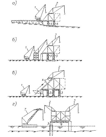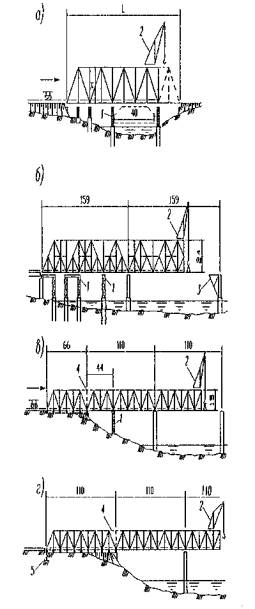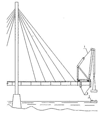 1 - временная опора; 2 - транспортное средство для подачи укрупненных блоков на монтаж; 3 монтажный кран; 4 - самоподъемная плавучая платформа в качестве временной опоры; 5 - шпренгель Рисунок 3 - Схемы полунавесного и навесного монтажа сплошностенчатых пролетных строений Навесной монтаж вантовых пролетных строений выполняют, как правило, неповоротными шевр-кранами большой грузоподъемности (до 100 т). При этом укрупненные блоки собирают на полное сечение моста и подают под кран на плавсредствах (рисунок 4).