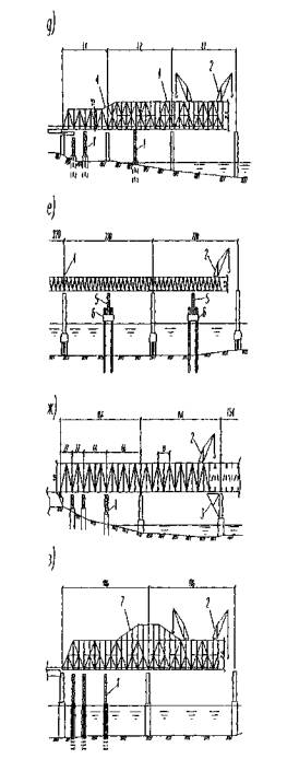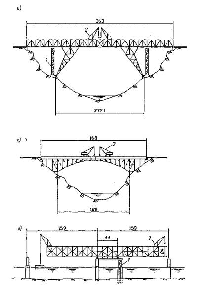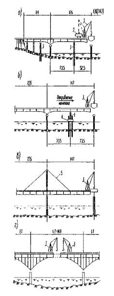 1 - временная опора из инвентарных конструкций; 2 - монтажный кран; 3 - приемная консоль; 4 - соединительные элементы; 5 - обстройка опор; 6 - самоподъемная плавучая платформа; 7 - шпренгель Рисунок 2 - Схемы полунавесного, навесного и уравновешенно-навесного монтажа решетчатых пролетных строений 8.2 Монтаж сплошностенчатых стальных и сталежелезобетонных пролетных строений балочно-неразрезных систем рекомендуется выполнять по схемам, приведенным на рисунке 3: а - полунавесной монтаж с устройством временных промежуточных опор. Главные балки переменной высоты; б - то же, с использованием самоподъемной плавучей платформы как временной опоры, перемещаемой из пролета в пролет; в - навесной монтаж с усилением пролетного строения шпренгелем; г - навесной монтаж балочно-подпружного пролетного строения с двух сторон с замыканием в середине пролета.