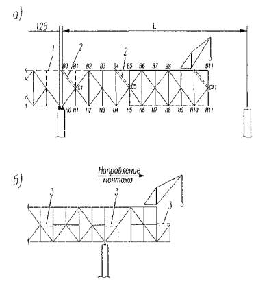1 - соединительные элементы; 2 - временный раскос; 3 - временная распорка Рисунок 5 - Расположение дополнительных временных элементов в шпренгельных фермах 8.7 Одновременно со сборкой панелей главных решетчатых ферм, секций сплошностенчатых балок и элементов проезжей части необходимо устанавливать продольные и поперечные связи в количестве, обеспечивающем неизменяемость и устойчивость собранной части пролетного строения. Отставание в сборке продольных и поперечных связей, если они мешают, по каким-либо причинам процессу монтажа более чем на одну панель не допускается. 8.8 Устанавливаемые в проектное положение элементы пролетных строений можно освобождать от стропов крюка крана только после точной наводки отверстий и постановки расчетного количества пробок и болтов в соответствии с требованиями п. 5.6 настоящего Стандарта организации. При наводке отверстий в собираемых конструкциях запрещается применять инструменты и приемы, искажающие и сминающие отверстия. Пробки в отверстия забивают подбойкой, имеющей массу не более 2 кг. Запрещается проверка точности совпадения отверстий на ощупь. 8.9 На капитальных опорах монтируемое пролетное строение в корне консоли следует устанавливать, как правило, на постоянные опорные части с закреплением их анкерными болтами. В случае необходимости компенсации больших прогибов консолей опорные части сверху можно наращивать по высоте пакетами из листовой стали. Размеры подкладных листов и отверстия в них под анкерные болты должны соответствовать размерам и отверстиям в верхних балансирах опорных частей. При монтаже пролетных строений моста в сейсмических районах должны быть учтены дополнительные воздействия от сейсмики в специальных инструкциях, разрабатываемых проектной организацией. 8.10 Гидравлические домкраты при установке пролетных строений на постоянные опорные части следует устанавливать в местах, предусмотренных для этой цели в чертежах КМ и КМД (под домкратными балками или под поясами у опорных узлов). Любые операции по поддомкрачиванию пролетных строений на капитальных опорах в местах, где пролетные строения объединяются на время монтажа в неразрезную систему, допускаются только в тех случаях, когда это предусмотрено проектом производства работ и, как правило, после снятия в этих местах соединительных элементов. Поддомкрачивание пролетных строений, объединенных на время монтажа в неразрезную систему, на капитальной опоре в корне собранной и свободно висящей консоли не допускается. Поддомкрачивание неразрезного пролетного строения в данном случае не рекомендуется. При выполнении работ по поддомкрачиванию неразрезных пролетных строений, предельные усилия, передаваемые домкратами, следует принимать по ППР. 9 Контроль качества монтажа9.1 До начала навесного монтажа пролетных строений следует инструментально проверить отметки и положение в плане подферменных площадок капитальных опор и оформить соответствующие акты. Положение продольных и поперечных осей ферм и балок наносят на опорах несмываемой краской. 9.2 Процесс монтажа должен сопровождаться постоянным пооперационным контролем, в том числе геодезическим. 9.3 Смонтированные конструкции до загружения их строительными и эксплуатационными нагрузками должны быть приняты комиссией в составе технических служ
