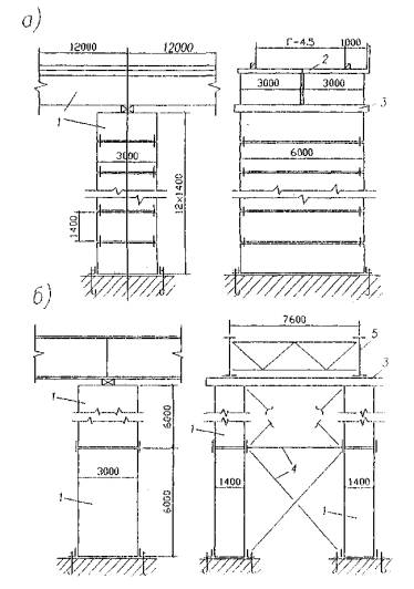 а - опоры и пролетные строения временного моста; б - временная опора для монтажа стальных пролетных строений