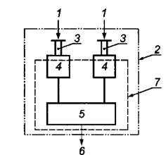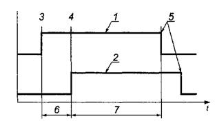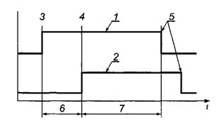 1 - входной сигнал; 2 - двуручное устройство управления; 3 - исполнительное устройство управления; 4 - преобразователь сигналов; 5 - устройство для обработки сигналов; 6 - выходной сигнал; 7 - логический блок Рисунок 1 - Схема двуручного устройства управления 3.3 исполнительное устройство управления (control actuating device): Составная часть двуручного устройства управления, принимающая входной сигнал от руки оператора и передающая его преобразователю сигналов (см. рисунок 1). 3.4 одновременное приведение в действие (simultaneous actuation): Непрерывное действие обоих исполнительных устройств управления в течение одинакового интервала времени независимо от запаздывания по времени между началом первого входного сигнала и началом второго входного сигнала (см. рисунок 2). Примечание - В английском языке слова «concurrent» и «simultaneous» часто используют как синонимы (см. 9.2.5.7 МЭК 60204-1 [2]).