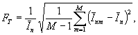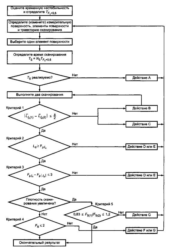 Вычисляют заново показатели FT, Возможны ситуации, когда критерии 1 - 3 выполняются, а критерий 4 не выполняется. В этих случаях плотность сканирования должна быть увеличена в два раза и более. Если отношение показателей неравномерности поля, полученных в предыдущих измерениях, к показателям текущего измерения удовлетворяет критерию 5 (см. С.1.6.2), полагают, что достигнута адекватная плотность сканирования и измеренные средние уровни интенсивности для каждого элемента поверхности могут быть использованы для вычисления излучаемой мощности. Если отношение показателей неравномерности поля FS(1), полученных в предыдущих измерениях, к показателю текущего измерения FS(2) не удовлетворяет критерию 5, следует увеличить плотность сканирования еще больше. В случае, когда повторение действий по увеличению плотности сканирования не приводит к выполнению заданного критерия, регистрируют нулевой результат и выясняют причину неудачи, или, используя [6], получают излучаемую мощность с точностью технического или ориентировочного метода. 9 Определение уровня звуковой мощности9.1 Вычисление звуковой мощности для каждого элемента измерительной поверхности Вычисляют звуковую мощность элемента поверхности в каждой частотной полосе для каждого элемента измерительной поверхности по формуле (5). 9.2 Вычисление нормализованного уровня звуковой мощности Вычисляют уровень звуковой мощности испытуемого источника Lw в каждой частотной полосе согласно формулам (8) и (9). Затем вычисляют уровень нормализованной звуковой мощности по формуле (10). Если звуковая мощность Р отрицательна в какой-либо частотной полосе, то метод настоящего стандарта не применим в данной полосе. В случае, когда требуется