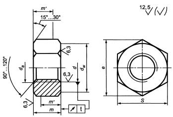 high-strength structural bolting with large width across flats. Дата введения - 2008-01-01 1 Область примененияНастоящий стандарт распространяется на высокопрочные шестигранные гайки с увеличенным размером под ключ (далее - гайки), предназначенные для использования в металлических конструкциях, применяемых в строительстве и машиностроении, эксплуатируемые в макроклиматических районах с умеренным (У) и холодным (ХЛ) климатом категории размещения 1 по ГОСТ 15150. 2 Нормативные ссылкиВ настоящем стандарте использованы нормативные ссылки на следующие стандарты: ГОСТ Р 9.316-2006 Единая система защиты от коррозии и старения. Покрытия термодиффузионные цинковые. Общие требования и методы контроля ГОСТ Р 52628-2006 (ИСО 898-2:1992, ИСО 898-6:1994) Гайки. Механические свойства и методы испытаний ГОСТ Р 52643-2006 Болты и гайки высокопрочные и шайбы для металлических конструкций. Общие технические условия ГОСТ Р 52644-2006 (ИСО 7411:1984) Болты высокопрочные с шестигранной головкой с увеличенным размером под ключ для металлических конструкций. Технические условия ГОСТ Р 52646-2006 (ИСО 7415:1984) Шайбы к высокопрочным болтам для металлических конструкций. Технические условия ГОСТ 9.306-85 Единая система защиты от коррозии и старения. Покрытия металлические и неметаллические неорганические. Обозначения ГОСТ 1759.0-87 Болты, винты, шпильки и гайки. Технические условия ГОСТ 1759.1-82 Болты, винты, шпильки, гайки и шурупы. Допуски. Методы контроля размеров и отклонений формы и расположения поверхностей ГОСТ 1759.3-83 Гайки. Дефекты поверхности и методы контроля ГОСТ 15150-69 Машины, приборы и другие технические изделия. Исполнения для различных климатических районов. Категории, условия эксплуатации, хранения и транспортирования в части воздействия климатических факторов внешней среды ГОСТ 16093-2004 (ИСО 965-1:1998, ИСО 965-3:1998) Основные нормы взаимозаменяемости. Резьба метрическая. Допуски. Посадки с зазором ГОСТ 24705-2004 (ИСО 724:1993) Основные нормы взаимозаменяемости. Резьба метрическая. Основные размеры Примечание - При пользовании настоящим стандартом целесообразно проверить действие ссылочных стандартов в информационной системе общего пользования - на официальном сайте Федерального агентства по техническому регулированию и метрологии в сети Интернет или по ежегодно издаваемому указателю «Национальные стандарты», который опубликован по состоянию на 1 января текущего года, и по соответствующим ежемесячно издаваемым информационным указателям, опубликованным в текущем году. Если ссылочный стандарт заменен (изменен), то при пользовании настоящим стандартом следует руководствоваться заменяющим (измененным) стандартом. Если ссылочный стандарт отменен без замены, то положение, в котором дана ссылка на него, применяется в части, не затрагивающей эту ссылку. 3 Конструкция и размеры3.1 Конструкция и размеры гаек должны соответствовать указанным на рисунке 1 и в таблице 1.