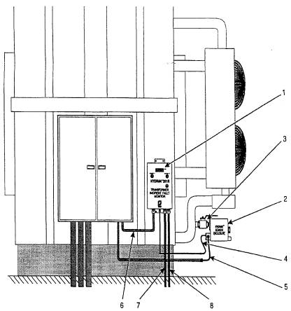 Информационные теги Рис. 3. Информационные обмены в системе. 1 - контроллер «Гидрана». 2 - датчик «Гидрана» 3 - кран шаровой 2». 4 - сигнальный кабель. 5 - кабель питания датчика. 6 - кабель питания контроллера. 7, 8 - кабели связи с внешним оборудованием. Рис. 4. Схема установки системы «Гидран».