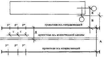 1.3. Для закрепления осей и базисных линий должны устанавливаться типовые конструкции марок (Рис. П.14.1. е, д). Конструкция марки, показанная на рис. П.14.1. д, предназначается для причальных стенок и портовых складов, а на рис. П.14.1. е для наземных крановых путей козловых и башенных кранов. Марки должны устанавливаться через 50 - 100 м с внутренней и наружной стороны каждой направляющей на определенном расстоянии (0,5 - 2 м) от её оси или прикордонной линии. Центры марок должны располагаться на одинаковом расстоянии от проектного положения оси направляющей. Линия, соединяющая эти центры, принимается за базисную. Базисные линии двух направляющих (А и Б) должны быть параллельными -рис П.14.1. 1.4. на каждой нити направляющих должна быть выполнена разметка: для путей с полушпалами - через 5 м, а с продольными железобетонными балками - через 3,12 м (стык и середина). Все точки должны маркироваться и нумероваться краской на шейке направляющих и располагаться в перпендикулярных створах, разбивка которых производится с помощью теодолита 1.5. На плане укладки наземного кранового пути должны быть указаны основные элементы технологической схемы и привязка всех элементов геодезической основы (Рис. П.14.1.).