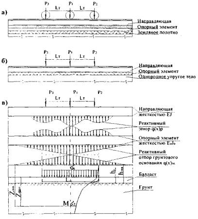 Рис П.5.1. Расчетная схема наземного кранового пути Для определения расчетной схемы конструкцию кранового пути представим как двухслойную балку, на сплошном упругом основании, состоящую из первого слоя балки - опорных элементов, уложенных вдоль направляющей поперек с определенным шагом (полушпалы) или длинной стороной (балки, плиты). Промежуточные скрепления обеспечивают фиксированное положение направляющей на опорных элементах, но не препятствуют продольному перемещению слоев двухслойной балки. Балластная призма и земляное полотно рассмотрим как сплошное упругое основание (рис. П.5.1. б). Расчетную схему наземного кранового пути с учетом действительной работы элементов, составляющих конструкцию, при воздействии колесных нагрузок от грузоподъемного крана следует рассматривать в следующем виде (рис. П.5.1. б): направляющая (рельс) - балка бесконечной длины (стыки во внимание не принимаются, так как стыковые накладки обеспечивают равно прочность и жесткость направляющей кранового пути) под воздействием одиночной или системы сосредоточенных колесных нагрузок имеет непрерывную связь (контакт) с опорными элементами; опорные элементы - балки бесконечной длины - под воздействием нагрузок, передаваемых направляющей, имеет непрерывную связь с направляющей и грунтовым основанием; грунтовое основание - балластная призма и земляное полотно - однородное упругое полупространство под воздействием нагрузки, передаваемой опорными элементами. Заменив элементы кранового пути стержнями, а связи - силами, получим основную систему сил (рис. П.5.1. в), которая будет представлять: направляющая - стержень, жесткостью EJ, под воздействием системы сосредоточенных сил (колесные нагрузки) и распределенной нагрузки (реактивный отпор); опорные элементы - стержень, жесткостью EJ, под воздействием распределенных нагрузок со стороны направляющей и реактивного отпора фунтового основания; балластная призма и земляное полотно - однородное упругое полупространство под воздействием распределенной нагрузки. Предложенные расчетная схема и основная система сил в большей степени соответствует действительной работе элементов кранового пути. ТЕОРЕТИЧЕСКИЕ РАСЧЕТЫ. При расчете балки, лежащей на сплошном упругом основании, в большинстве случаев пользуются дифференциальным уравнением четвертого порядка изогнутой оси балки где EJ - жесткость балки, y(x) - вертикальное перемещение нейтральной оси балки, q(x) - распределенная реакция со стороны основания. Величины y(x) и q(x) являются неизменными, для их определения требуется составить еще одно дополнительное уравнение, устанавливающее зависимость между ними. Принятая зависимость между y(x) и q(x) определяет различие в методах расчета балки, лежащей на сплошном упругом основании. Гипотеза Фусса-Винклера (или гипотеза "коэффициента постели") исходит из предпосылки о пропорциональности перемещения элементарной площадки поверхности фунта внешним давлениям на эту площадку. В этом случае между перемещениями оснований y(x) и реактивным давлением q(x) существует соотношение где C - коэффициент постели (пропорциональности) с размерностью МПа/м3. Для модели упругого полупространства, имеющего модуль деформации (упругости) E0 и коэффициент Пуассона μ0, прогиб в точке поверхности полупространства с координатами х, у, вызванный дей