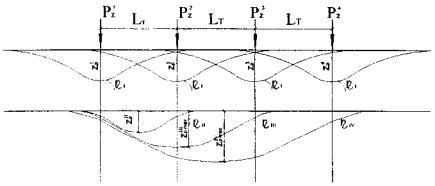 Рис. П.5.1.2 Прогибы рельсов под воздействием двух-, трех-, и четырехколесных тележек.