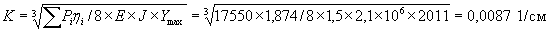 где, Rсж = 5 кгс/см2 - расчетное сопротивление на сжатие балластного материала; Ymax = 1,5 см - предельно допустимая упругая просадка основание. Bоп - приведенная ширина металлической плиты эквивалентна шпальной решетки с деревянными полушпалами Bоп = ав/Г·γ4·γ5 = 135×25/60×0,83×0,85 = 39,68 см где а = 135 см - длина полушпалы; в - 25 см - ширина полушпалы; Г = 70 см - расстояние между осями полушпал; γ4 = 0,83 - коэффициент изгиба полушпал, учитывающий неравномерность опирания; γ5 = 0,85 - коэффициент условия работы полушпал (однотипность полушпал износ и т.д.) Ордината линии влияния эпюры прогибов ηi = 0,937 (при КХ = 0,0094×33,5) Коэффициенты относительной жесткости кранового пути с учетом нагрузки