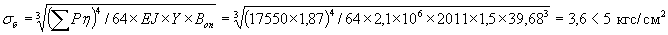 Ордината линии влияния эпюры изгибающих моментов μ = 0,199 при KХ = 0,0087×70 Ордината линии влияния эпюры прогибов η =0,9350 при KХ = 0,0087×35 4. Определение расчетных величин в элементах пути Осевые и кромочные напряжения в рельсах при изгибе под действием вертикальных сил σк.о. = ∑Ppμi/4×K×Wp = 17550×1,199/4×0,0087×285 = 2121,6 < R = 3000×0,75 = 2250 кгс/см2 Напряжения в балластном слое непосредственно под плитой