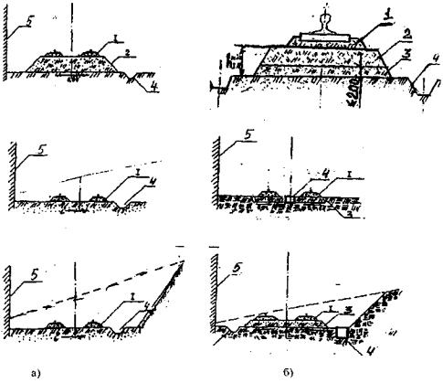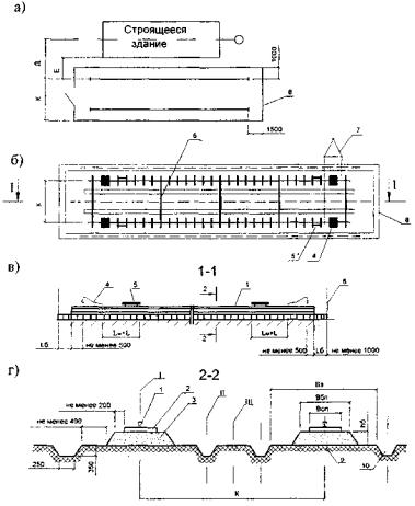 5 - коэффициент. Ширина плеча земляного полотна Высота балластной призмы должна быть не менее 0,1м; Ширина плеча балластной призмы должна быть не менее 0,2 м; Минимальная ширина балластной призмы (Bбп) определяется по формуле, м: Bбп = Iоэ + 0,4; (6) где, 0,4 - константа, включающая две ширины балластной призмы, м. ж) Объем материала балластной призмы рассчитывается по формуле: Vб = l,3·2·Lбпhб(Bбп + 0,5hбп) (7) где hбп - требуемая высота балласта под опорным элементами, м; 1,3 - коэффициент, величина, учитывающая уплотнение балласта и его потери при устройстве балластной призмы; 2 - число раздельных балластных призм; Lбп - длина балластной призмы, м; 3. РЕКОМЕНДАЦИИ ПО УСТРОЙСТВУ НАЗЕМНЫХ КРАНОВЫХ ПУТЕЙ3.1. Общие рекомендации3.1.1. Принято, чтобы наземный крановый путь соответствовал проекту, а также положениям "Правил по кранам" (ПБ-10-382-00) и настоящих Рекомендаций. 3.1.2. Наземный крановый путь включает нижнее, верхнее строение и путевое оборудование. Общий вид (план), продольный и поперечный профиль наземного кранового пути с обозначением основных элементов и размеров показан на рис. П.6.1 (Приложение 6) Примерные поперечные профили крановых путей различных конструкции приведены на рис. П.6.2 - П.6.6 - Приложение 6. 3.1.3. Все отступления от проекта и настоящих Рекомендаций согласовываются владельцем пути с организацией разработчиком проекта и Ростехнадзором. 3.1.4. Все земляные работы, связанные с прокладкой подземных коммуникаций, заканчиваются к началу возведения земляного полотна. 3.1.5. Для обеспечения контроля планово-высотного положения элементов кранового пути в процессе его устройства и эксплуатации он оборудуется знаками геодезической основы - реперами, створными знаками и т.п. Крановые пути, срок эксплуатации которых не превышает один год, могут быть оборудованы временными закрепляющими знаками (репер, створные знаки и т.п.). 3.2. Рекомендации по нижнему строению пути3.2.1. В состав нижнего строения наземного кранового пути входят земляное полотно и водоотвод. 3.2.2. Каждая нитка верхнего строения наземного кранового пути размещается на самостоятельном или общем земляном полотне. 3.2.3. Перед возведением земляного полотна необходимо выполнить следующие подготовительные работы: очистить площадку от строительного мусора, посторонних предметов, а в зимнее время, от снега и наледи; установить на местности разбивочные знаки (оси кранового пути и направляющих, высотные отметки-реперы и полосы отвода). 3.2.4. Земляное полотно возводится из основного или насыпного грунта, или из их смеси. В последнем случае грунт может быть песчаным или однородным с основным. Откосы в месте примыкания насыпного грунта должны быть 1:1,5. 3.2.5. При возведении земляного полотна из насыпного грунта необходимо использовать, местные грунты и отходы металлургических, горнодобывающих и других производств, отвечающих рекомендациям, предъявляемым к грунтам земляного полотна. 3.2.6. Насыпной грунт укладывается слоями с обязательным послойным уплотнением. Способ уплотнения и толщина уплотняемого слоя определяется в зависимости от вида и естественной плотности грунта, а также от вида и типа грунтоуплотняющих машин и оборудования (см. табл. 3.1). Зависимость толщины уплотненного слоя грунта от типа уплотняющих машин и механизмов
