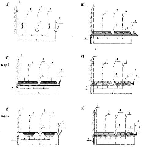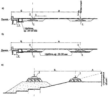 Рис. П.6.3. Типы земляного полотна наземных крановых путей: а) на мало сжимаемых природных грунтах; б) на слабых природных грунтах по всей ширине земляного полотна (вар. 1) и под нитями направляющих кранового пути (вар. 2); в) на планировочных насыпях - подсыпках;