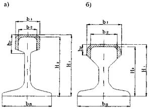 Рис. П.7.1. Поперечный профиль направляющих (а - типа Р; б - типа КР). H1 - высота рельса; Н2 - высота изношенного рельса; hr - высота головки; b1 - ширина головки; b2 - ширина изношенной головки; bп - ширина подошвы. Основные размеры и масса направляющих типа Р и КР