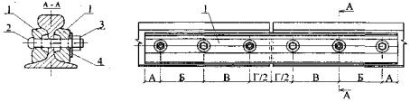 Рис. П.7.4. Разъемное стыковое скрепление для направляющих типа КР. 1 - специальная накладка; 2 - болт; 3 - гайка; 4 - шайба пружинная.