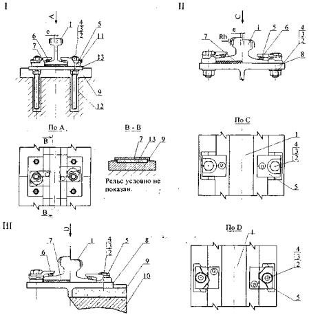 Рис. П.7.11. Промежуточные скрепления с эластичным элементом (типа GANTREX): I - на стальном или железобетонном основании II - на опорных балках III - на железобетонных опорных элементах. Rh - максимально воспринимаемое боковое усилие в кН; е - диапазон регулирования направляющей в горизонтальной плоскости; 1 - направляющая; 2, 3, 4 - болт, шайба, гайка (анкер); 5 - прижим; 6 - опора из синтетического эластомера; 7 - упругая подкладка из синтетического эластомера; 8 - опорный элемент; 9 - мелкозернистый бетон; 10 - железобетон; 11 - регулятор высоты при необходимости; 12 - отверстие для установки анкера; 13 - стальная опорная плита.