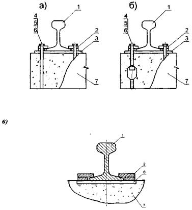 а, б) разъемное с нестандартными и стандартными закладными болтами по ГОСТ 16017; в) неразъемное. 1 - направляющая; 2 - прижим; 3 - упругая прокладка; 4 - болт; 5 - гайка; 6 - шайба; 7 - железобетонный опорный элемент.