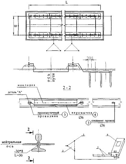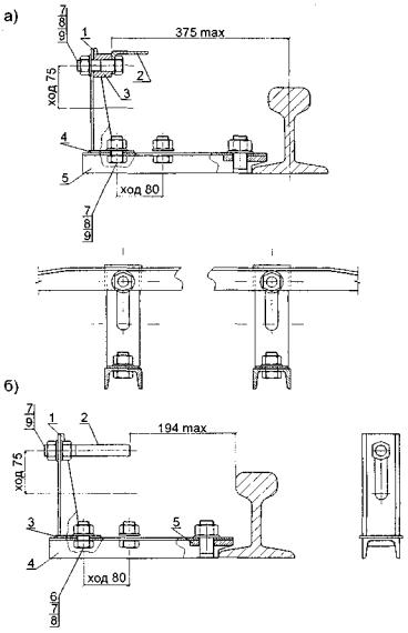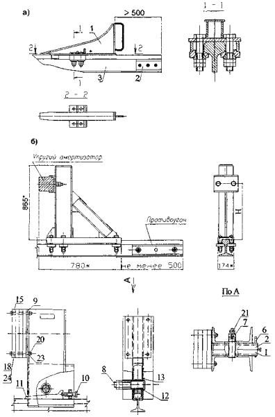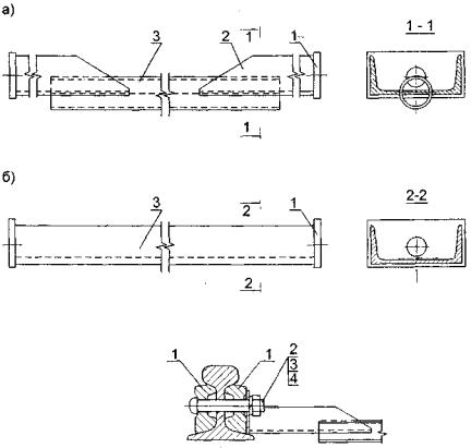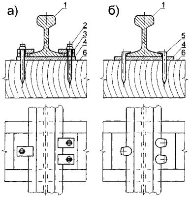 Рис. П.7.13. Прикрепление направляющих к полушпалам: а) шурупами; б) костылями 1 - направляющие 2 - шуруп путевой; 3 - прижим; 4 - подкладка; 5 - костыль; 6 - полушпала. Приложение 8.ПУТЕВОЕ ОБОРУДОВАНИЕ НАЗЕМНЫХ КРАНОВЫХ ПУТЕЙ