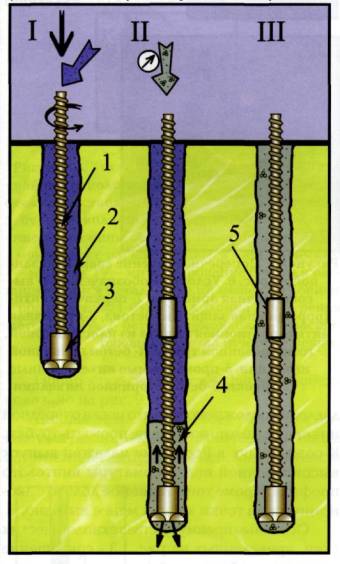 Рисунок 1. Технологическая схема устройства буроинъекционных свай сваи Titan (Ischebeck Gmbh). I - Бурение скважины с промывкой рабочей жидкостью теряемой буровой колонной. II - Замещение рабочей жидкости бетоном. III - Готовая свая. Условные обозначения. 1 - винтовая высокопрочная полая арматура, 2 - рабочая жидкость, 3 -буровая коронка, 4 - бетон, 5 - соединительная муфта.