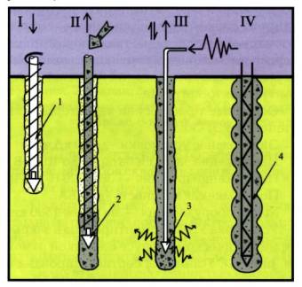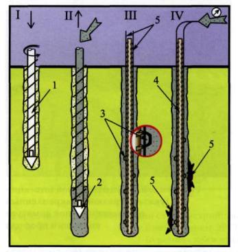 Рисунок 3. Технологическая схема устройства буроинъекционных свай сваи GEWI (Dywidag). I, II - Устройство скважины и заполнение ее бетоном, III - Погружение одиночной арматуры с закрепленными на ней трубками для инъекции. IV - Инъекция бетона через инъекционные трубки. Условные обозначения. 1 - проходной шнек, 2 - клапан шнека, 3 - клапаны для инъекции, 4 - одиночный центральный стержень из высокопрочной арматуры с винтового профиля, 5 - инъекционные трубки.