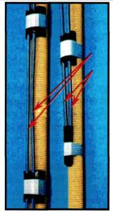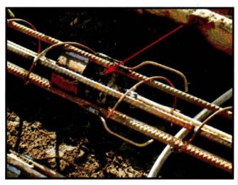 Рисунок 5. Клапан вторичной инъекции (указан стрелкой), закрепленный на высокопрочной арматуре винтового профиля Для обеспечения надежного результата и обеспечения качественной опрессовки на одной инъекционной трубке располагают порядка 3-х клапанов (так как заранее неизвестно какой из клапанов «сработает»). Той же фирмой разработана конструкция для многократной вторичной инъекции, которая осуществляется через промываемые инъекционные трубки (рис. 6, 7).