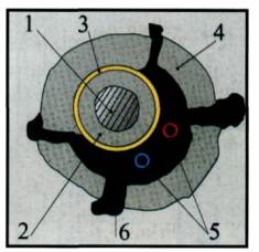 Рисунок 7. Поперечное сечение сваи, показанной на рис. 6. Условные обозначения. 1 - высокопрочная арматура, 2 - первичная антикоррозионная защита из бетона, 3 - вторичная антикоррозионная защита из пластмассовой гофрированной трубы, 4 - бетон первичной инъекции, 5 - промываемые инъекционные трубки, 6 - бетон вторичной инъекции. Описанные технологии устройства свай имеют преимущества и недостатки. Например, армирование свай одиночным стержнем менее эффективно, чем армирование пространственным каркасом. Выполнение многократной инъекции через трубки высокого давления осложнено тем, что после очередной инъекции можно вообще не промыть трубки. К сожалению, в России не налажен выпуск высокопрочной полой арматуры винтового профиля. Кроме того, теряемое долото с экономической точки зрения менее выгодно. Основные преимущества технологических схем, приведенных на рис. 1, 3 - сокращение сроков устройства свай (за счет упрощения технологической схемы), простота стыковки арматурного каркаса. Одним из положительных моментов является то, что для уменьшения величины защитного слоя и повышения коррозионной стойкости конструкции можно использовать пластмассовые гофрированные трубы. Армирование одиночным стержнем на муфтовом соединении позволяет отказаться от сварочных работ (что достаточно актуально для подвальных помещений), сократить время стыковки. Фирма «Soilex» разработала свою конструкцию и технологию устройства буроинъекционных свай и анкеров. Суть технологии состоит в бурении скважины любым способом, обеспечивающим устойчивость стенок скважины. Далее производится установка трубы с расширяющимся металлическим мешком на конце, выполненным из очень тонкого металлического листа. Затем производится подача под давлением твердеющего раствора в трубу (см. рис. 8).
