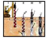 Рисунок 8. Технологическая схема устройства свай по технологии фирмы "Soilex". I - бурение скважины станком CFA (НПШ), II - Извлечение буровой колонны с одновременным заполнением скважины бетоном, III - погружение армокаркаса с расширяющимся металлическим мешком, IV - инъектирование бетона в расширяющийся металлический мешок. Условные обозначения. 1 - буровая колонна для бурения методом CFA, 2 - бетон, 3 - армокаркас, 4 - расширяющийся металлический мешок. Поперечное сечение сваи фирмы «Soilex» показано на рис. 9.