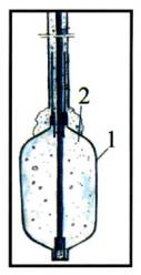 Рисунок 9. Поперечное сечение сваи фирмы «Soilex». 1 - расширяющийся металлический мешок, 2 - мелкозернистый бетон. Данная технология имеет ряд недостатков. Для расширения металлического мешка изготовители вынуждены использовать чисто цементный раствор. К отставляемому металлическому мешку требуется установка каркаса. Свая, выполненная по данной технологии, работает только по пяте. Однако, если по геологии нет достаточно хорошего несущего слоя, который может служить основанием для пяты сваи, то применение такого типа свай нецелесообразно. В качестве альтернативы зарубежным технологиям в Московском строительстве с 1990 г. применяется электроразрядная геотехническая технология (ЭРГТ) для устройства буроинъекционных свай и анкеров [3, 4]. Технология основана на использовании энергии электрических разрядов в скважинах, заполненных мелкозернистым бетоном (см. рис. 10).